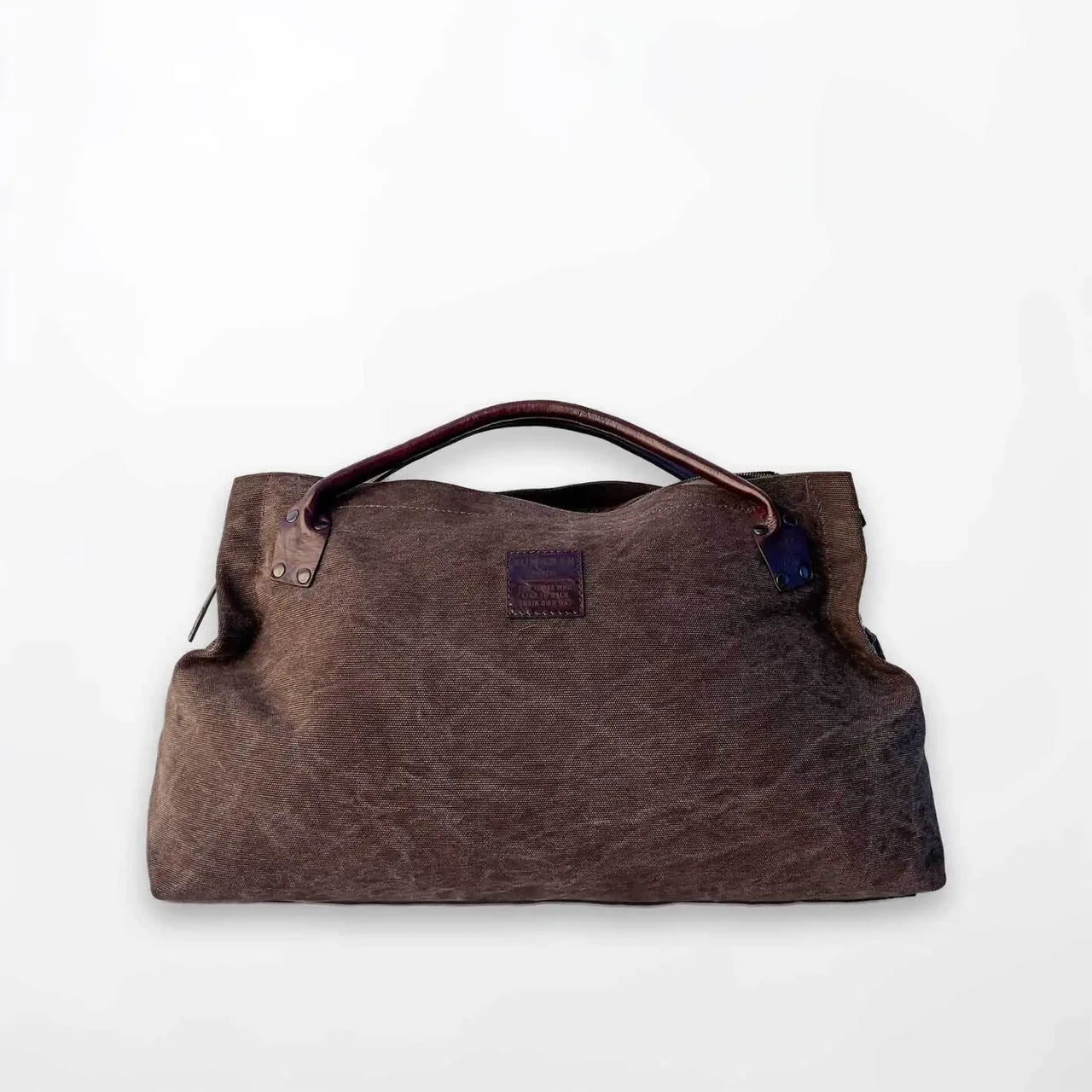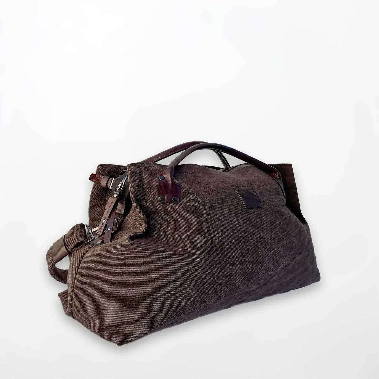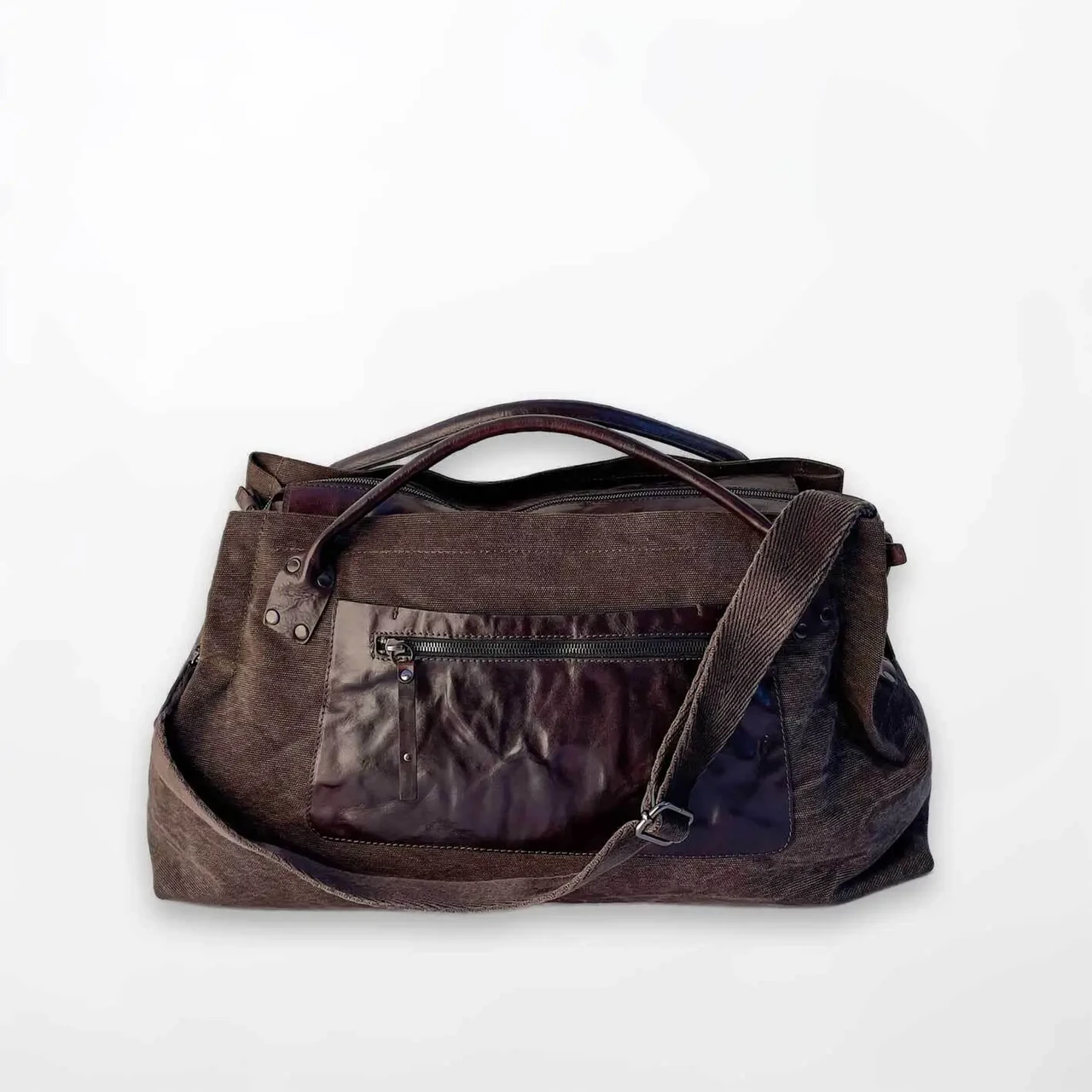 A bag made of strong water and dirt repellent canvas for weekend. The bag has a leather zippered back pocket. There are two additional pockets inside, one of them also has a zipper. Comfortable, adjustable strap. Available in different colors.