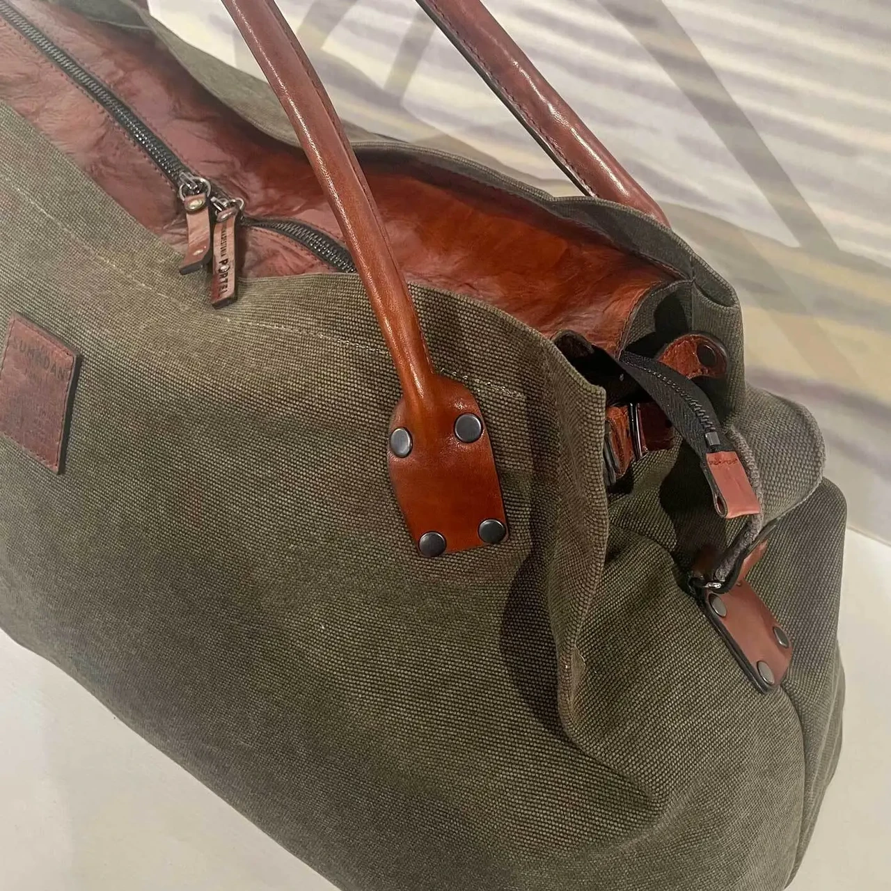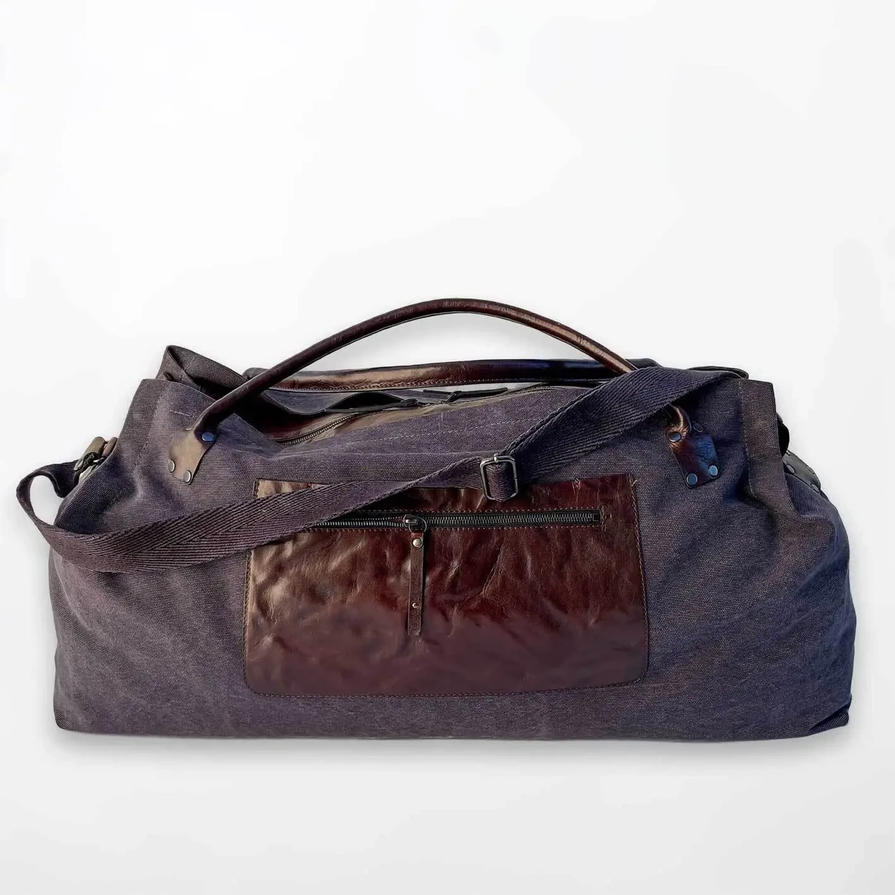 A bag made of strong water and dirt repellent canvas for weekend. The bag has a leather zippered back pocket. There are two additional pockets inside, one of them also has a zipper. Comfortable, adjustable strap. Available in different colors.